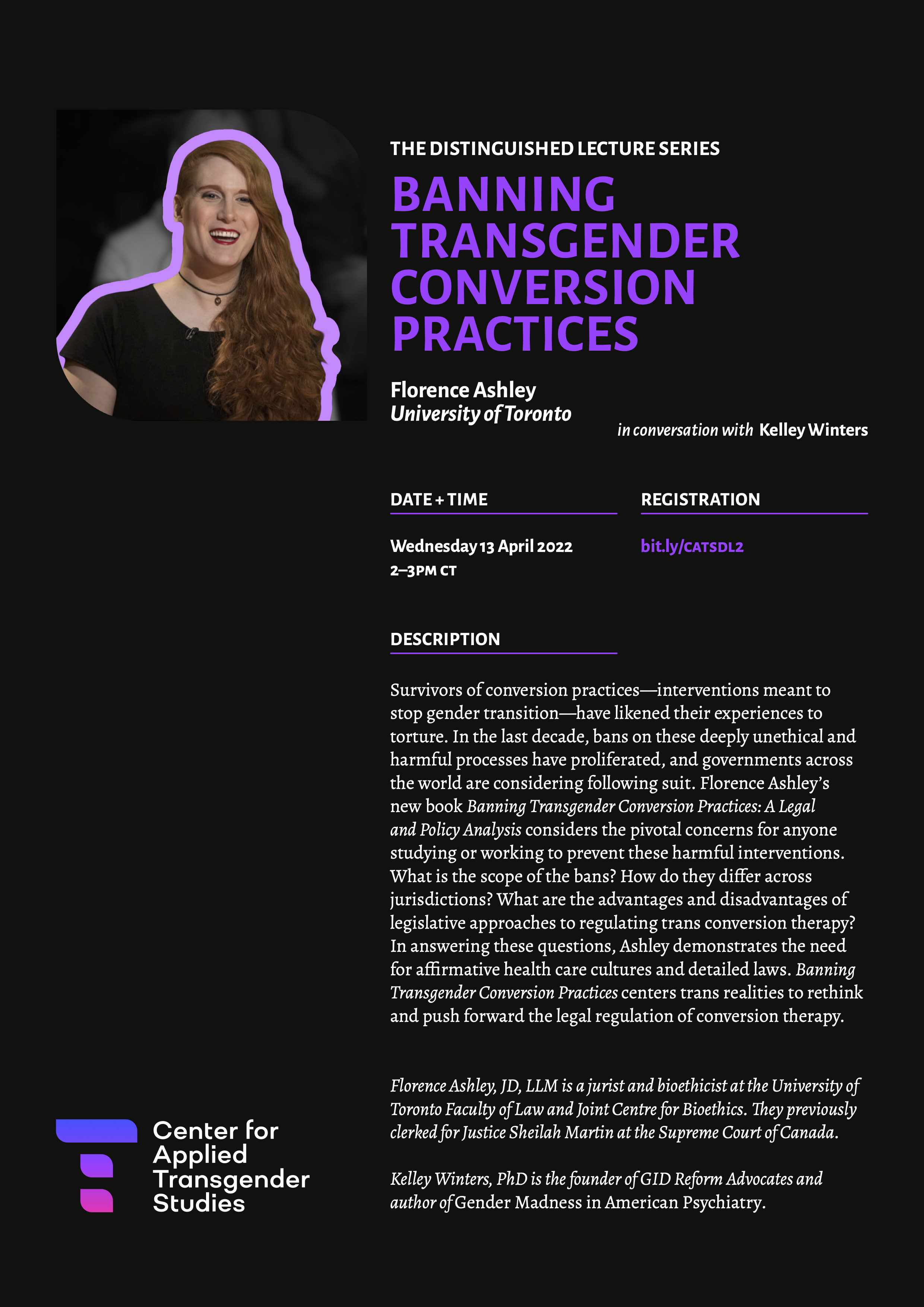 Join us for the Center for Applied Transgender Studies’ next Distinguished Lecture from Florence Ashley, JD, LLM on Wednesday 13 April 2022. The Lecture will celebrate the launch of Ashley’s new book Banning Transgender Conversion Practices: A Legal and Policy Analysis (University of British Columbia Press, 2022) and will include a moderated discussion with Kelley Winters, PhD. Full details and registration link below!